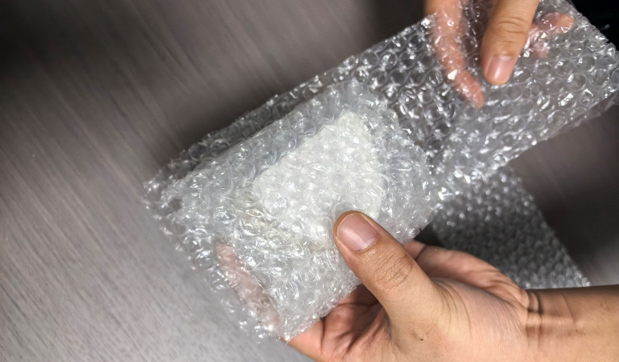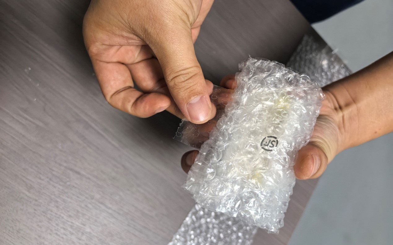 Once the front and back protection is complete, use tape to seal the bubble wrap, securing the package so it does not loosen or open. This completes the first stage of protection.