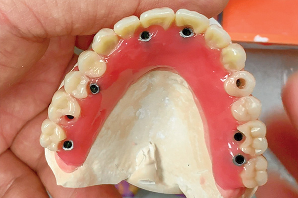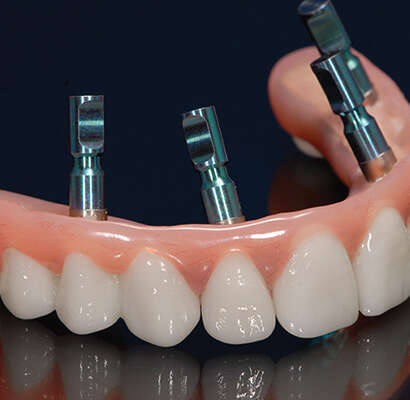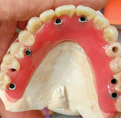 Hybrid implant denture is a full-arch prosthesis with the esthetics of conventional dentures and stability of implant-retained restorations. Supported by titanium posts anchored into the jawbone, this hybrid solution delivers long-term durability, greater chewing efficiency, and more patient comfort. It is an excellent choice for edentulous patients who desire a fixed, natural-appearing, and less costly solution over removable dentures.